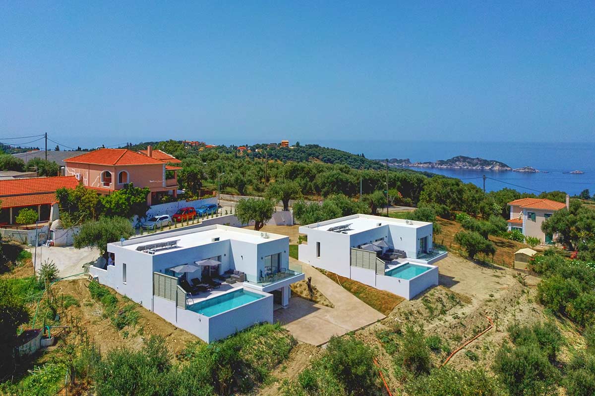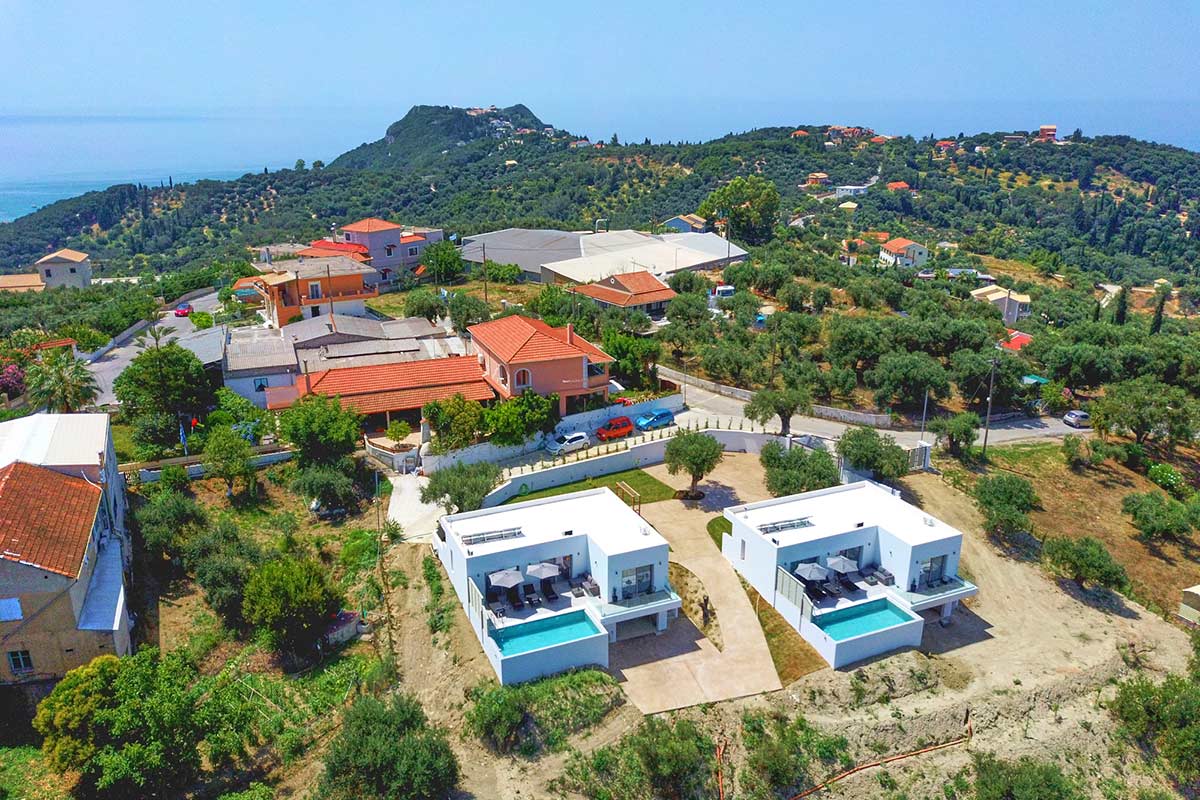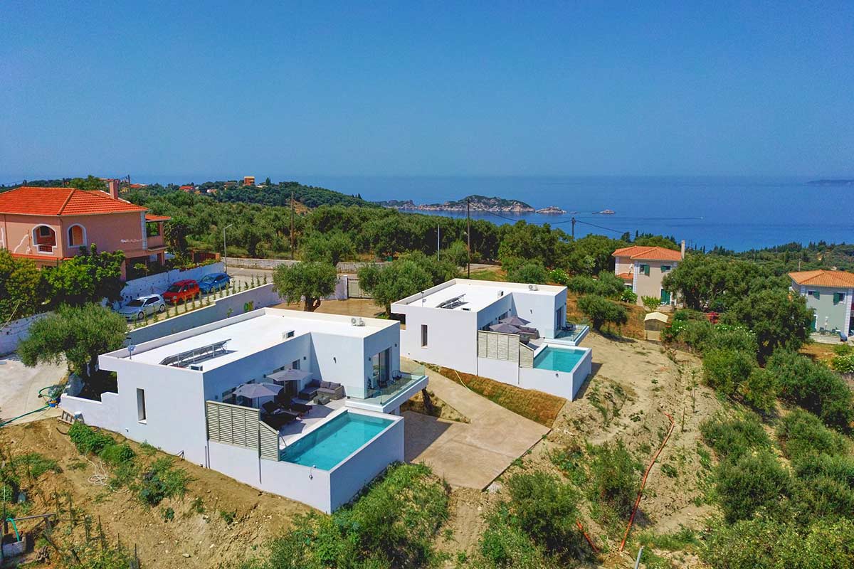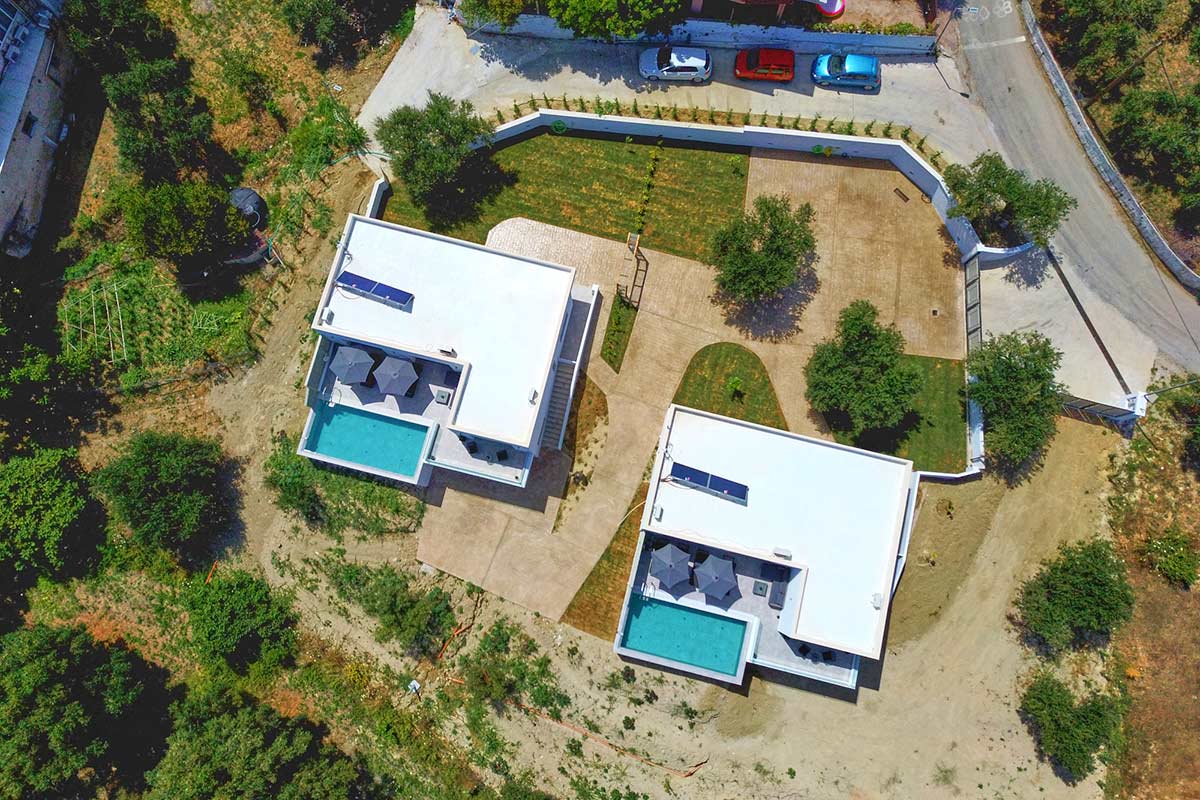 Our twin Polgar Villas comprises exceptional luxury accommodation with private pools and stunning views to Arillas and Diapontia Islands. Each Villa can sleep up to 4 guests in a living space of 95sq.m. Polgar Villas are situated in the North West Corfu at the village of Kavvadades. The location is suitable for couples and families who wish to spend relaxing and peaceful holidays with easy access (a few minutes driving) to sandy organized beaches and spots with unrepeatable ocean views and sunsets. Polgar villas offer privacy in a fenced property with an outdoor spacious communal area with lawn and paving. Each villa has its own private pool and can be rented separately.