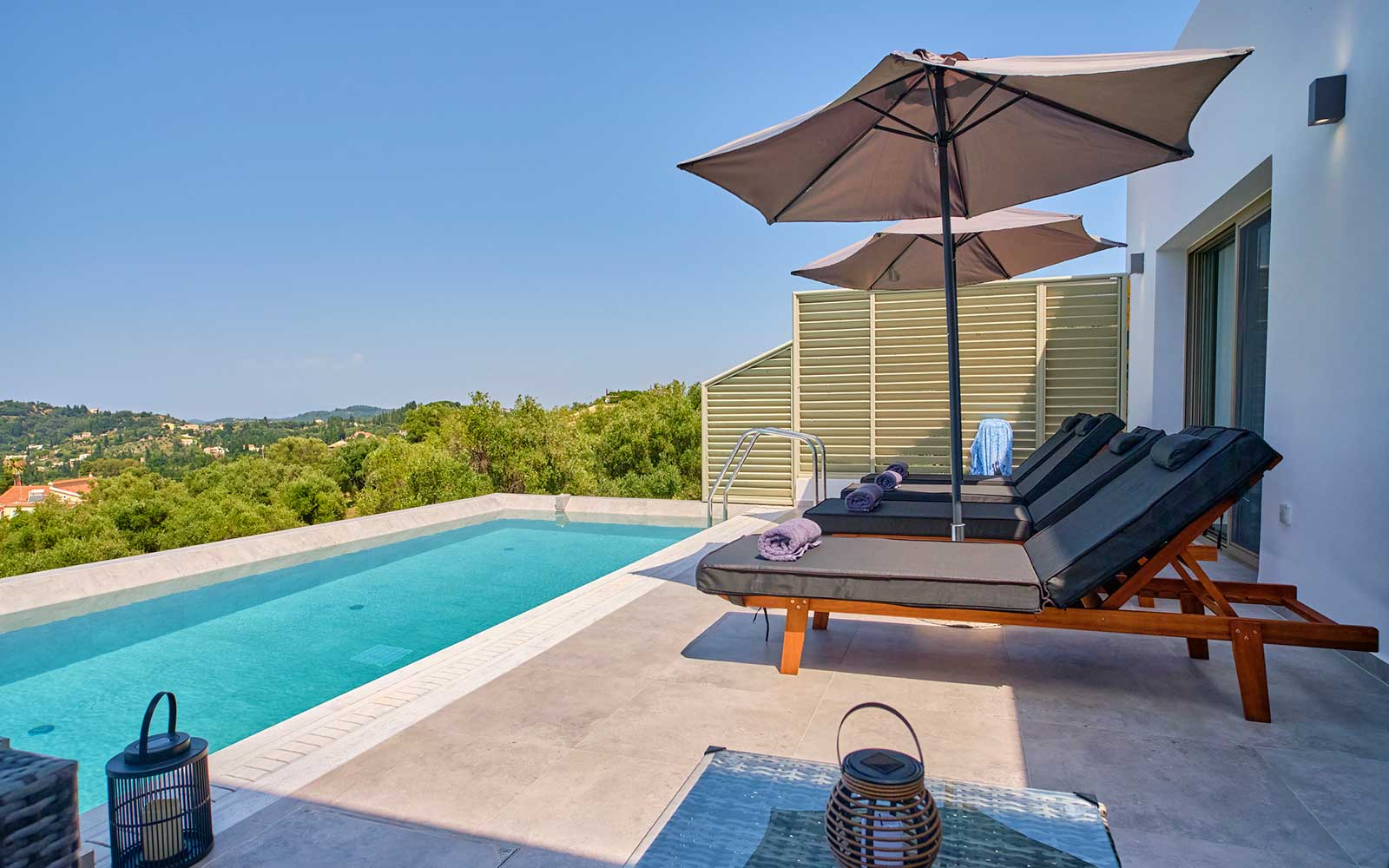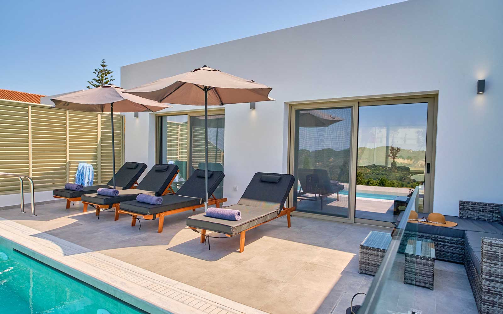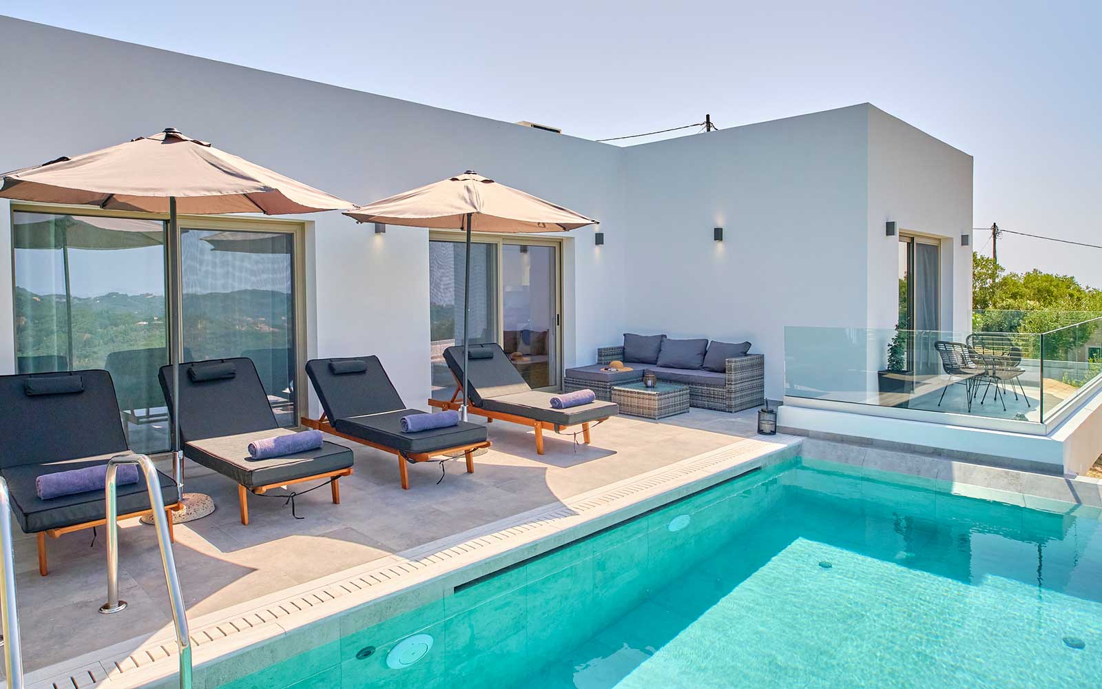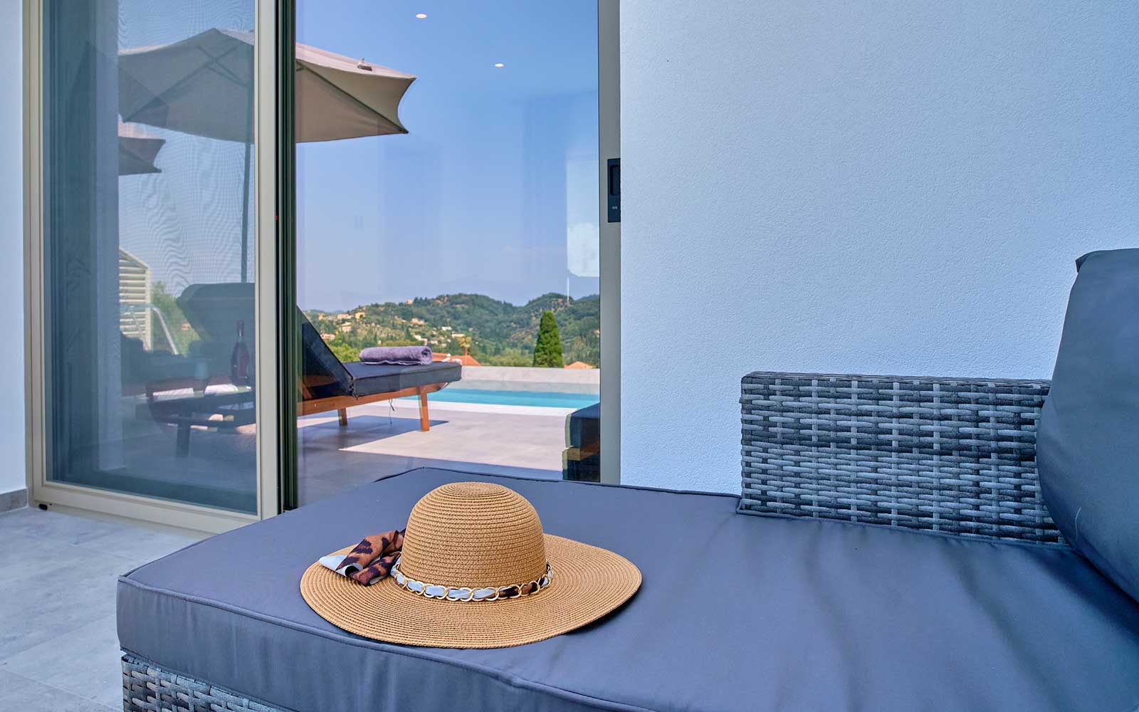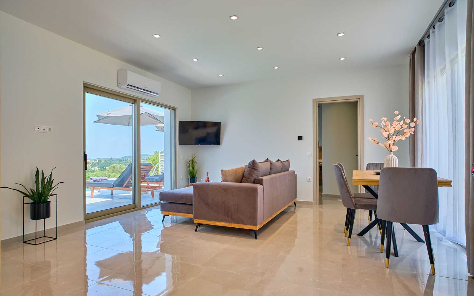 Entering the modern luxury villa there is a large open plan living room area with kitchen and dining area. The kitchen offers all the electric appliances and equipment for the guests comfort. (Dishwasher, washing/dryer machine, microwave, Nespresso machine, toastier, kettle, handy mixer, induction hobs and oven, large fridge etches). The living room features a large corner sofa and 43’’ smart Tv. Its large glazing door leads to the furnished patio with the infinity private swimming pool (depth: 1,40m – length: 7*3m.) There are set luxury sun loungers with thick cushions, parasols and another seating sofa. The view of Arillas and the sunsets are amazing.