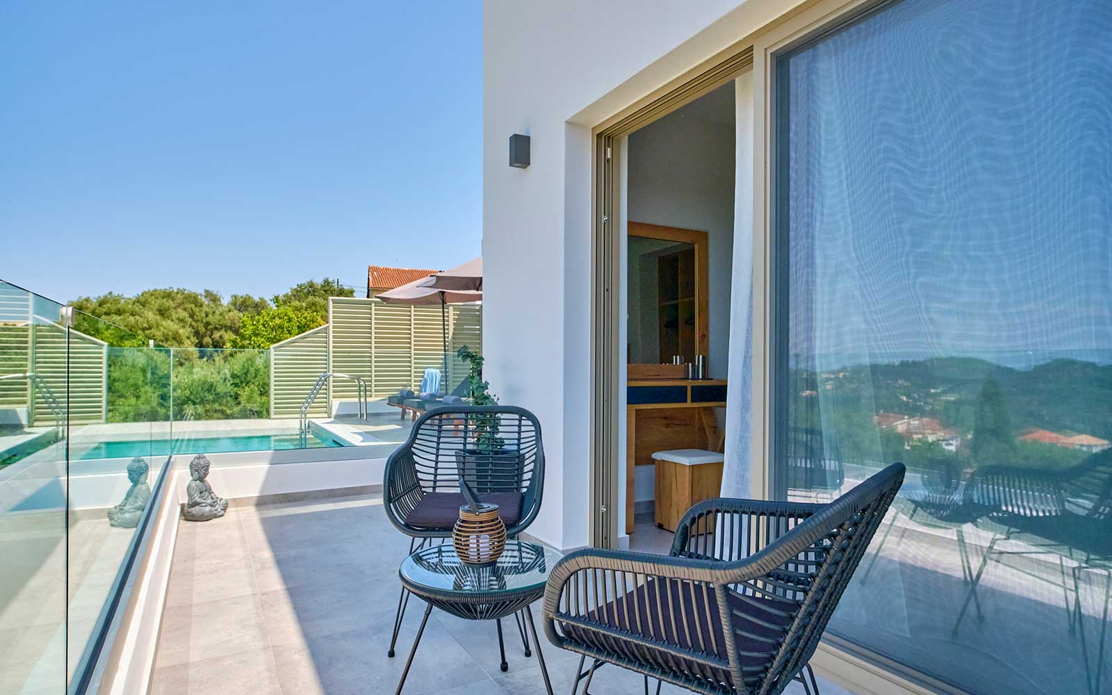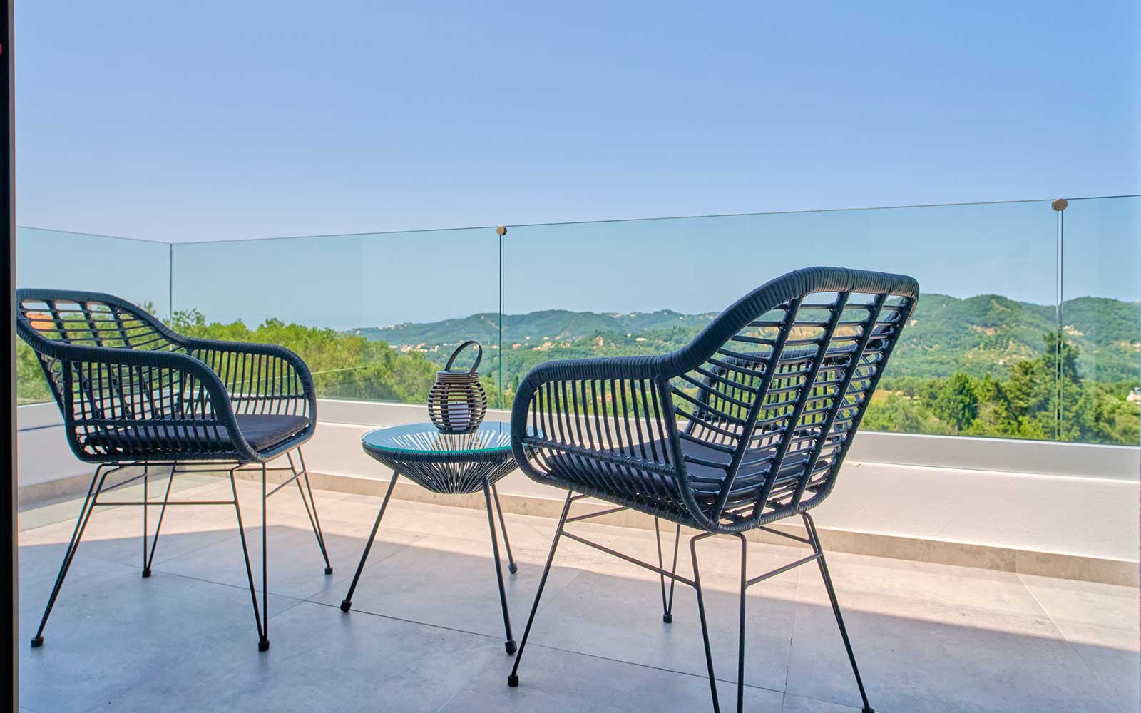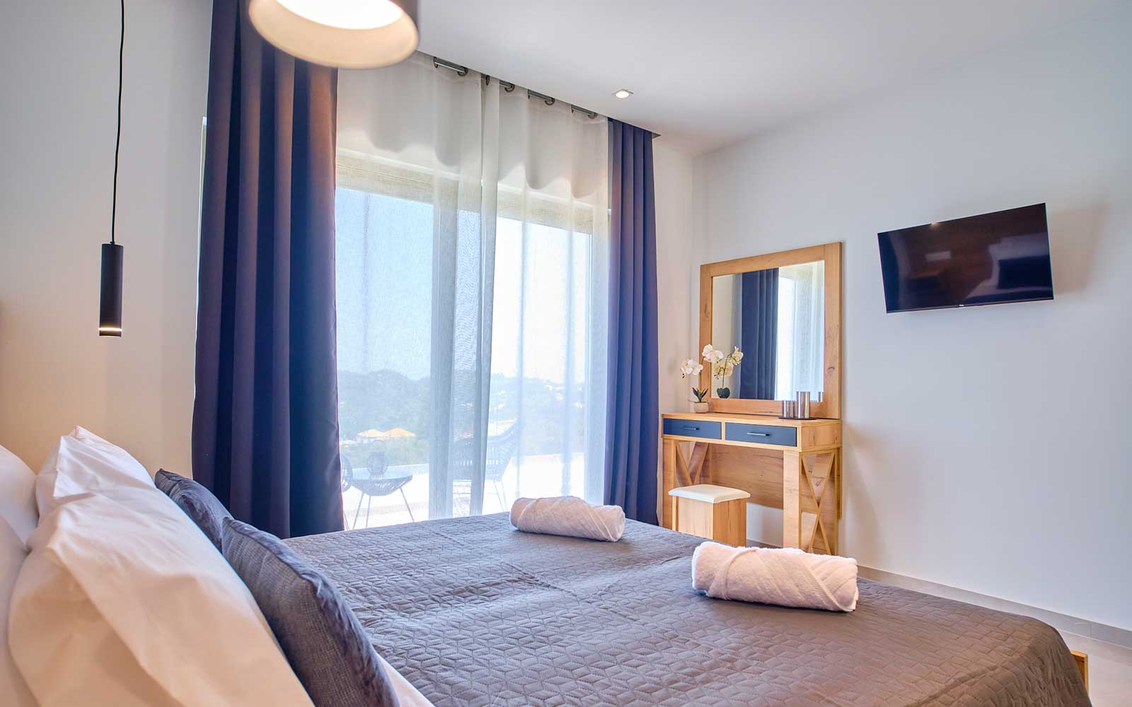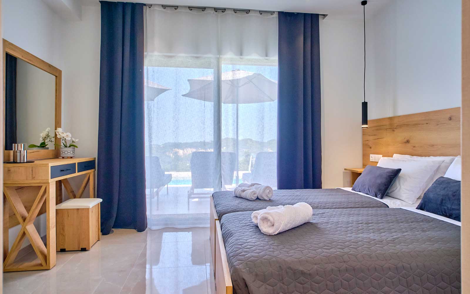 Entering the modern luxury villa there is a large open plan living room area with kitchen and dining area. The kitchen offers all the electric appliances and equipment for the guests comfort. (Dishwasher, washing/dryer machine, microwave, Nespresso machine, toastier, kettle, handy mixer, induction hobs and oven, large fridge etches). The living room features a large corner sofa and 43’’ smart Tv. Its large glazing door leads to the furnished patio with the infinity private swimming pool (depth: 1,40m – length: 7*3m.) There are set luxury sun loungers with thick cushions, parasols and another seating sofa. The view of Arillas and the sunsets are amazing.