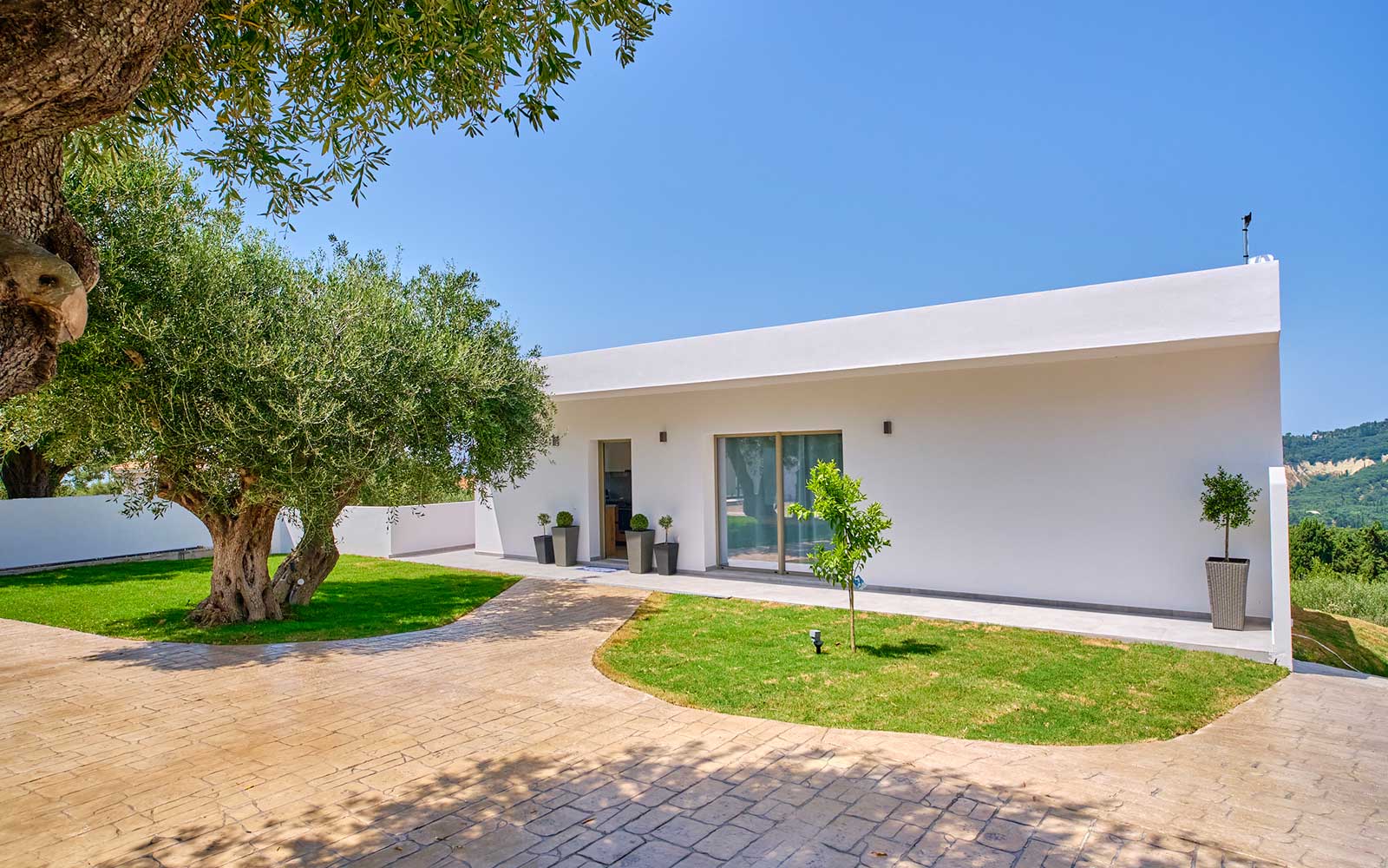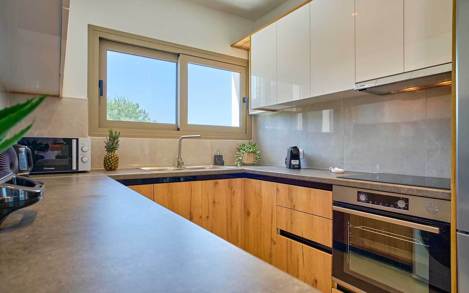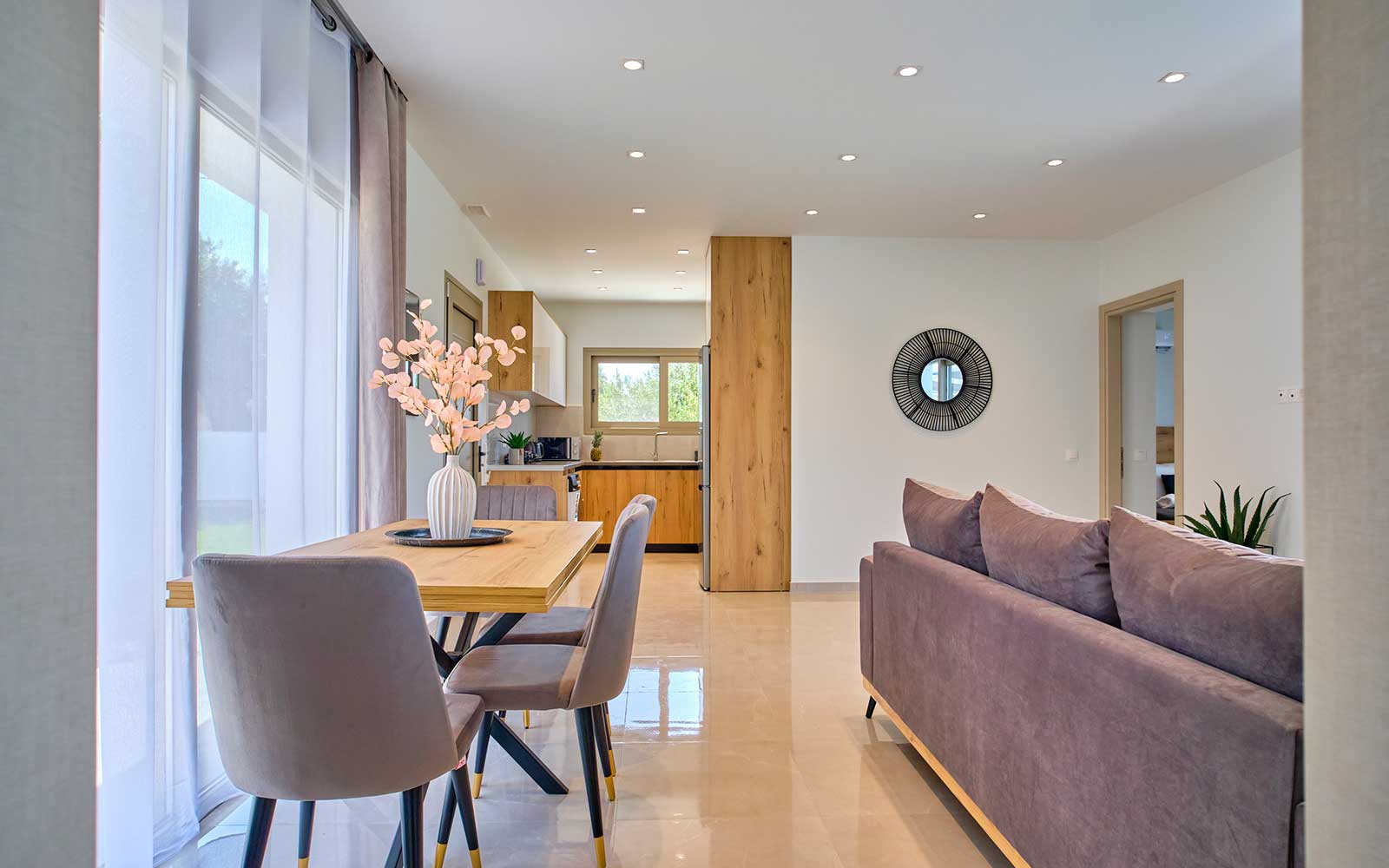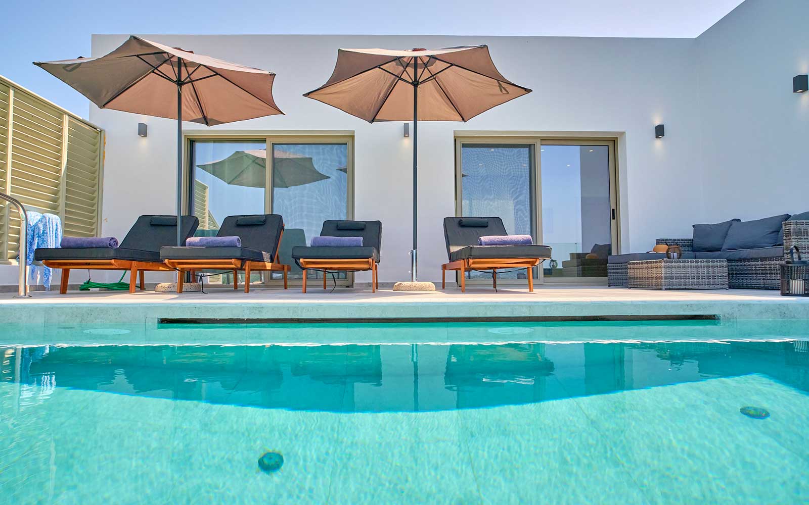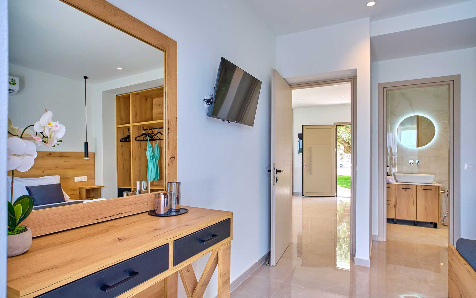 Entering the modern luxury villa there is a large open plan living room area with kitchen and dining area. The kitchen offers all the electric appliances and equipment for the guests comfort. (Dishwasher, washing/dryer machine, microwave, Nespresso machine, toastier, kettle, handy mixer, induction hobs and oven, large fridge etches). The living room features a large corner sofa and 43’’ smart Tv. Its large glazing door leads to the furnished patio with the infinity private swimming pool (depth: 1,40m – length: 7*3m.) There are set luxury sun loungers with thick cushions, parasols and another seating sofa. The view of Arillas and the sunsets are amazing.