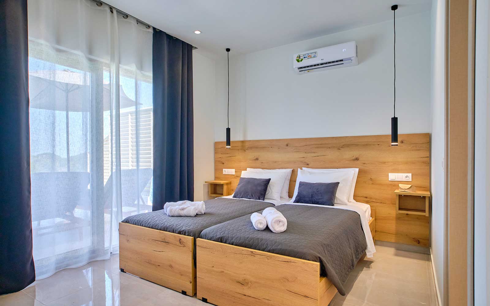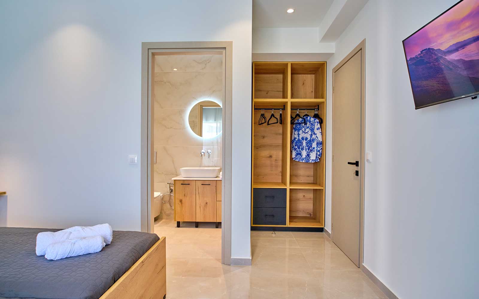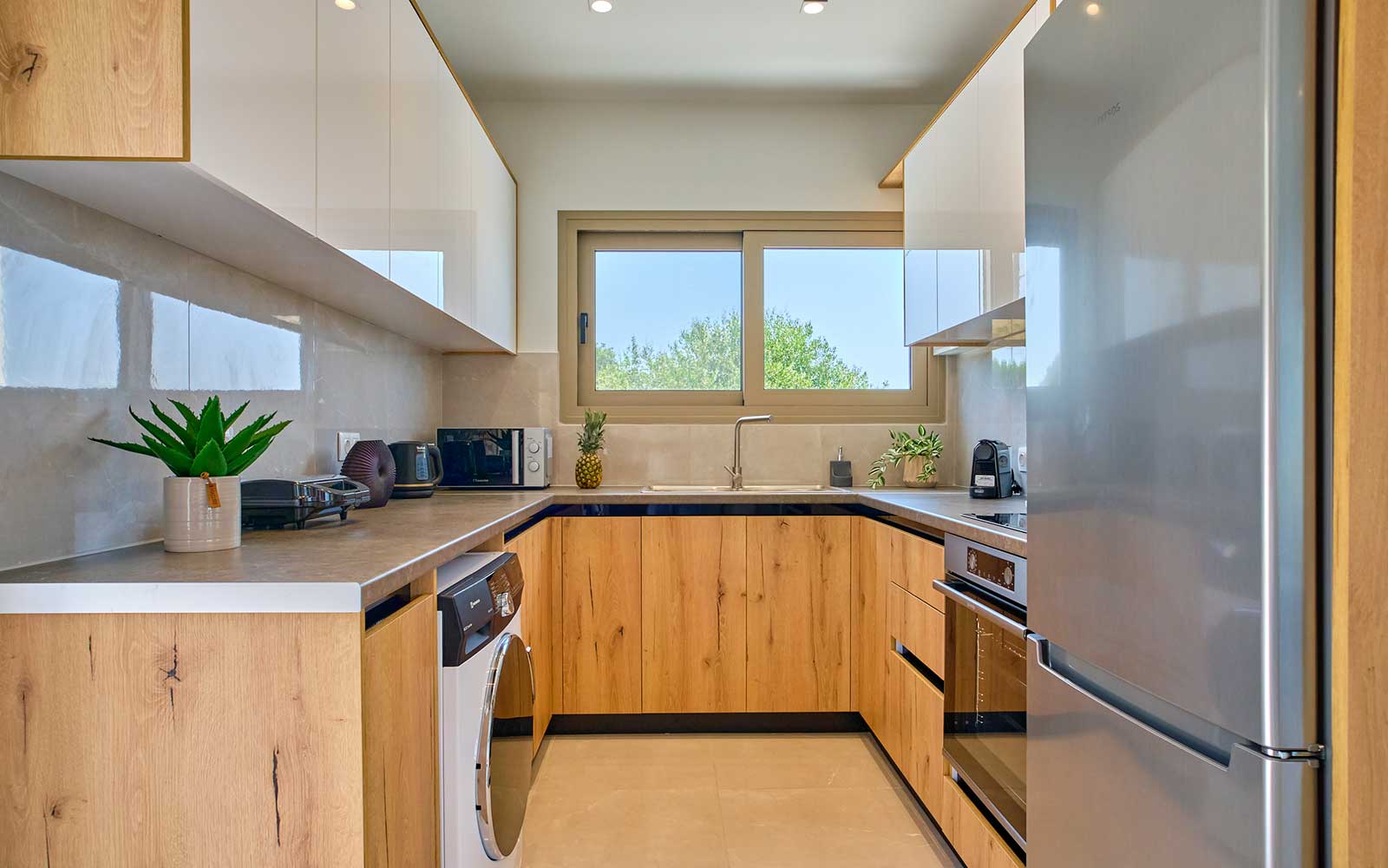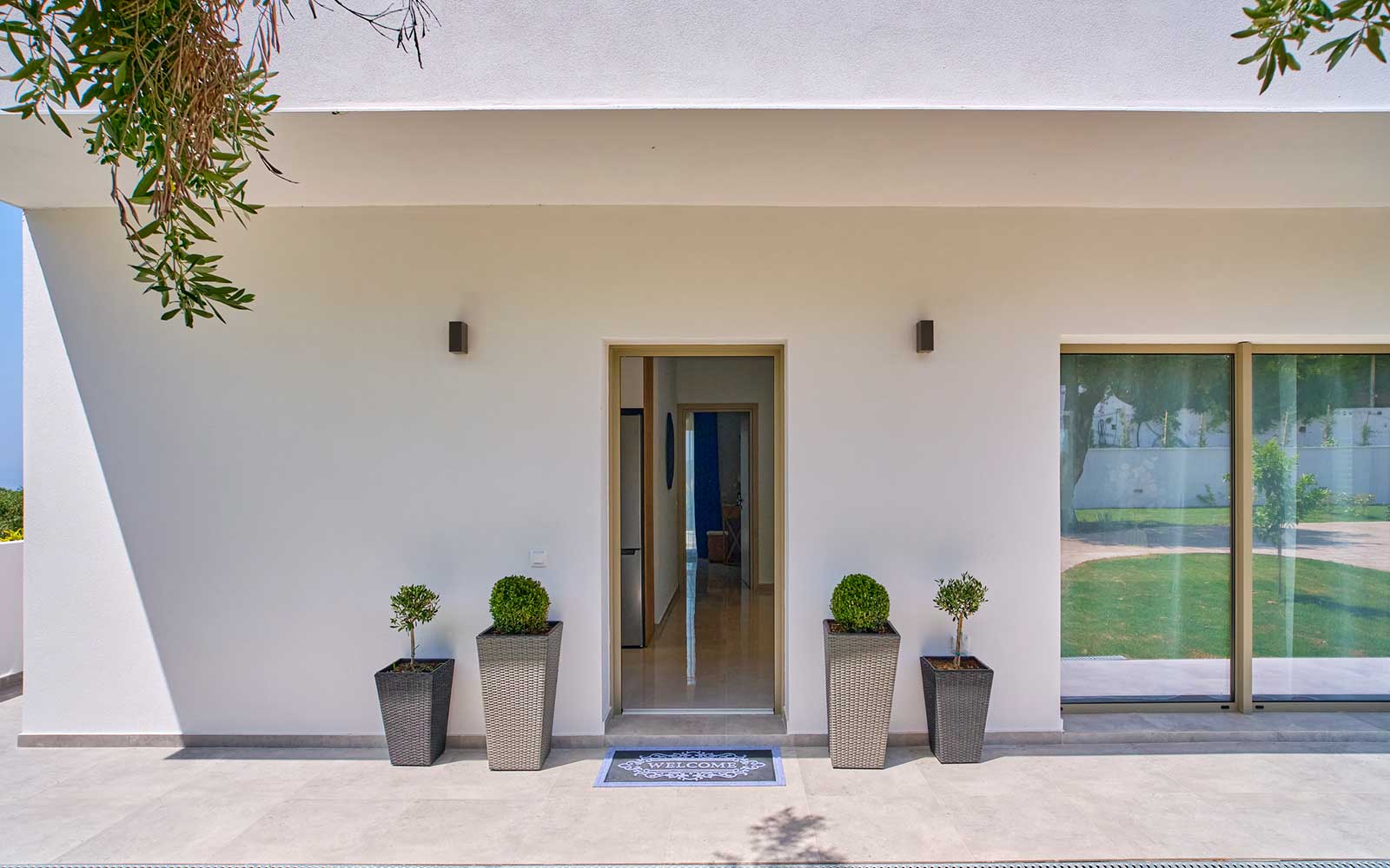 Entering the modern luxury villa there is a large open plan living room area with kitchen and dining area. The kitchen offers all the electric appliances and equipment for the guests comfort. (Dishwasher, washing/dryer machine, microwave, Nespresso machine, toastier, kettle, handy mixer, induction hobs and oven, large fridge etches). The living room features a large corner sofa and 43’’ smart Tv. Its large glazing door leads to the furnished patio with the infinity private swimming pool (depth: 1,40m – length: 7*3m.) There are set luxury sun loungers with thick cushions, parasols and another seating sofa. The view of Arillas and the sunsets are amazing.