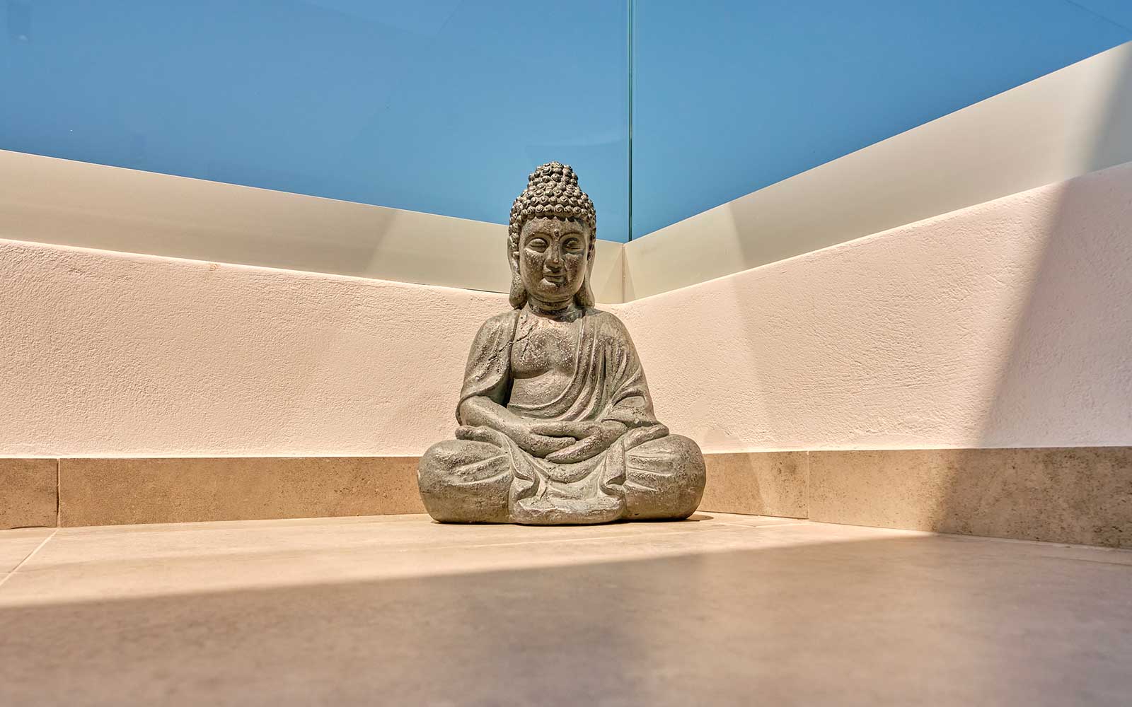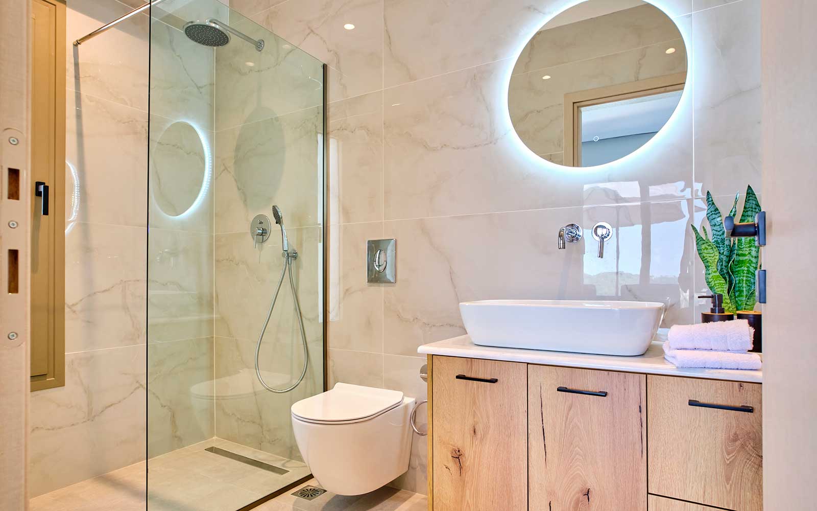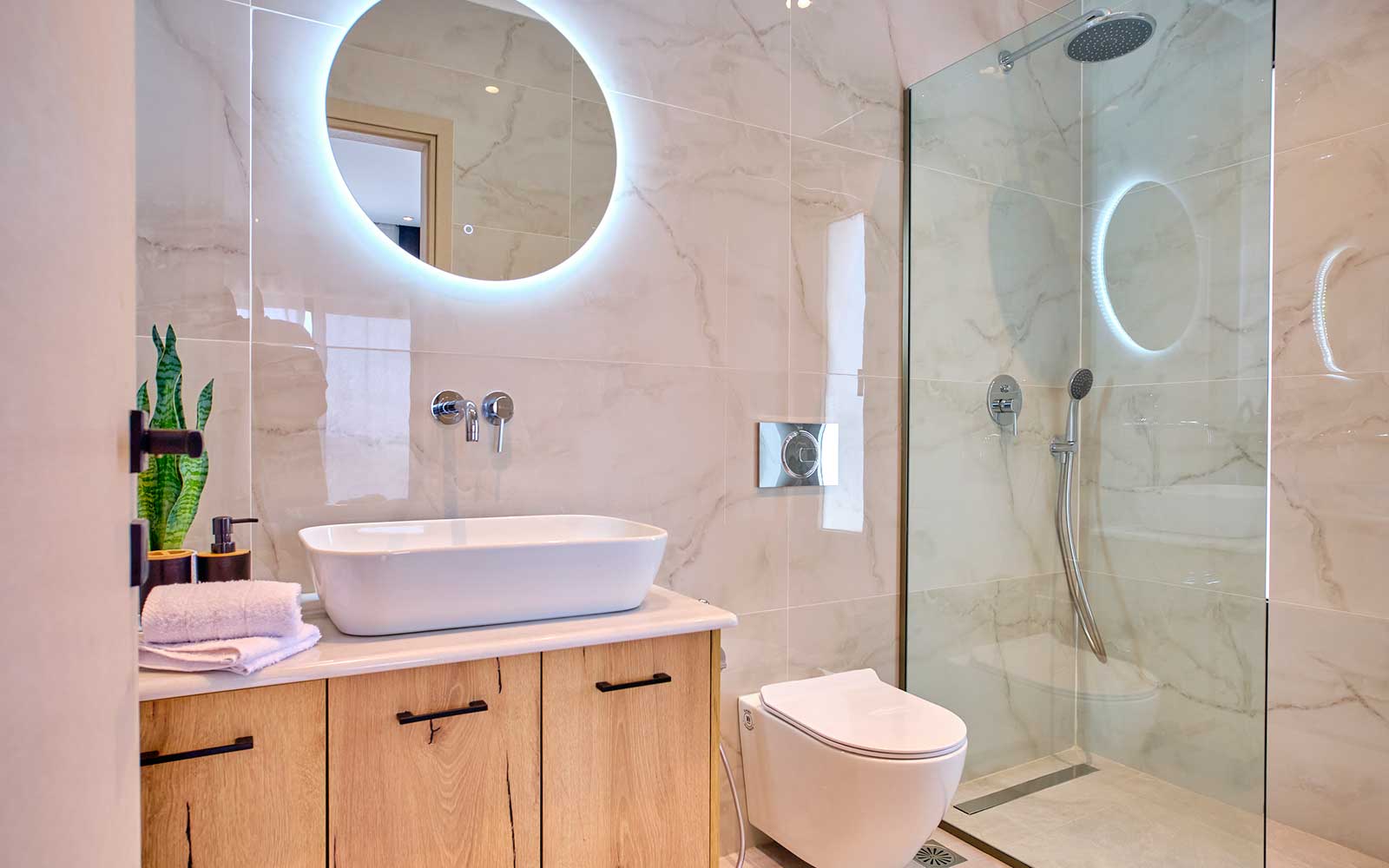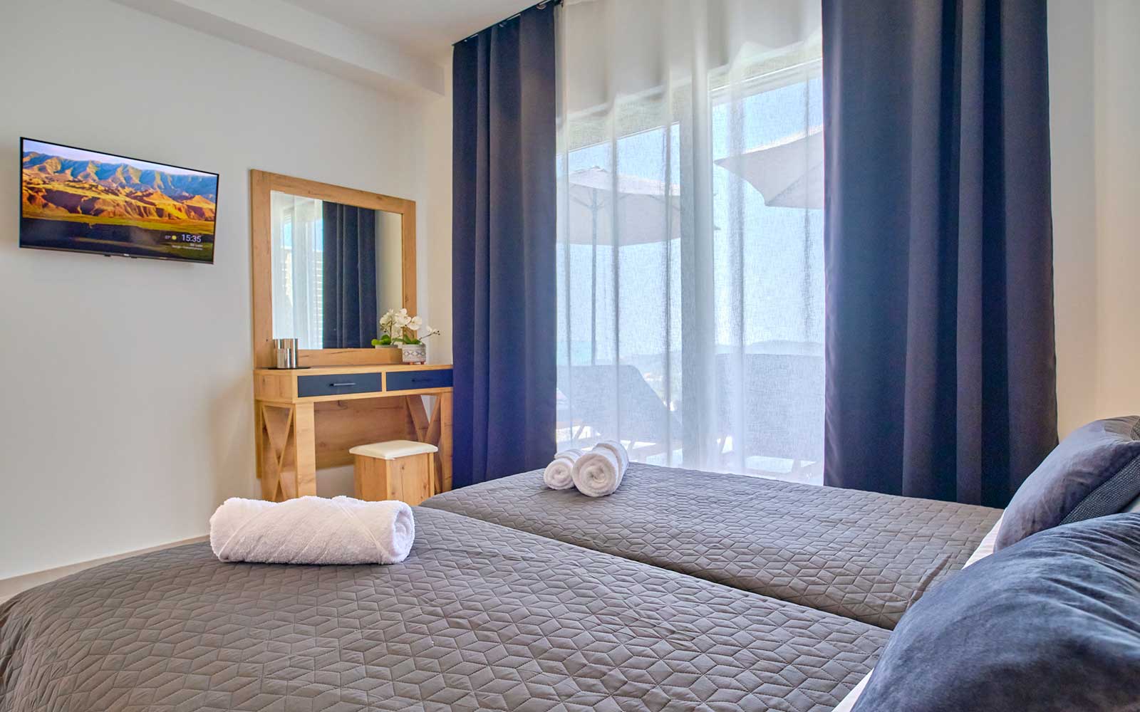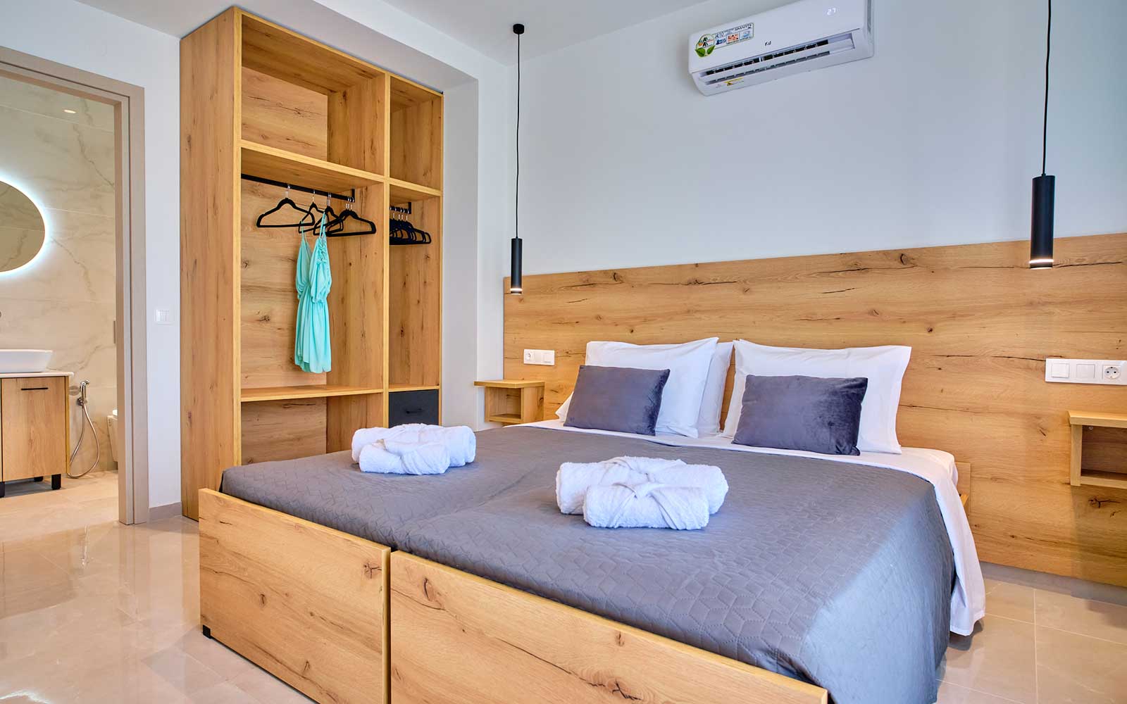 Entering the modern luxury villa there is a large open plan living room area with kitchen and dining area. The kitchen offers all the electric appliances and equipment for the guests comfort. (Dishwasher, washing/dryer machine, microwave, Nespresso machine, toastier, kettle, handy mixer, induction hobs and oven, large fridge etches). The living room features a large corner sofa and 43’’ smart Tv. Its large glazing door leads to the furnished patio with the infinity private swimming pool (depth: 1,40m – length: 7*3m.) There are set luxury sun loungers with thick cushions, parasols and another seating sofa. The view of Arillas and the sunsets are amazing.
